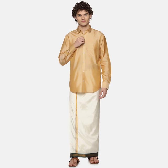 Cream solid readymade dhoti, has a velcro waist band, a contrast zari border and a pocket