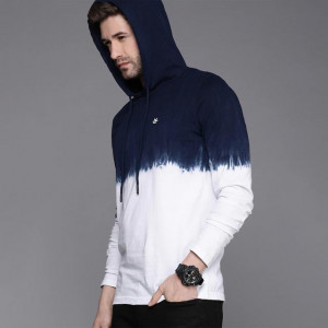 Men Navy Blue White Colourblocked Slim Fit Hooded Pure Cotton T-shirt
